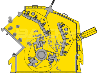通過給料設備送到破碎機后,高速旋轉的巨型錘或板錘將大型物料拋向上方,與正在進入破碎機腔體的物料相互撞擊自然破碎,余力又將尚未破碎的物料拋向頂部反擊襯板,反復打擊,依靠石打石及石打鐵的原理實現(xiàn)物料的破碎。