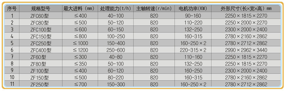 ZFC250型新型高效節(jié)能型二合一破碎機術參數(shù):